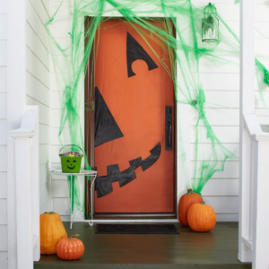 Another kid-friendly and cute option is creating a jack-o-lantern for your door. This idea is inspired by Party City, which gives step-by-step instructions on how to create this for your own front door for Halloween. You’ll need supplies such as orange and black plastic table colors and stretchy cobwebs.